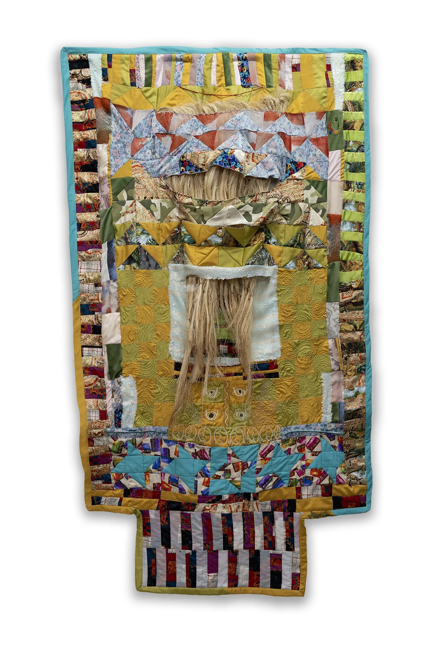 2026, East River orisha, 84 x 43 inches, mixed media quilt, oil on canvas, and acrylic on satin.